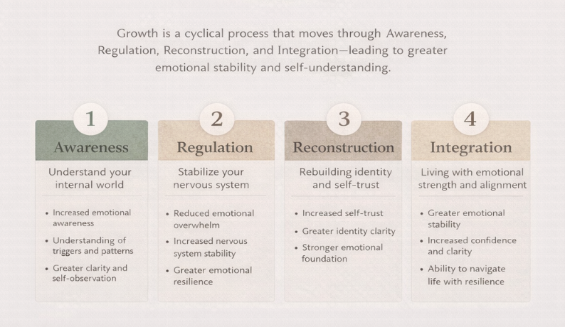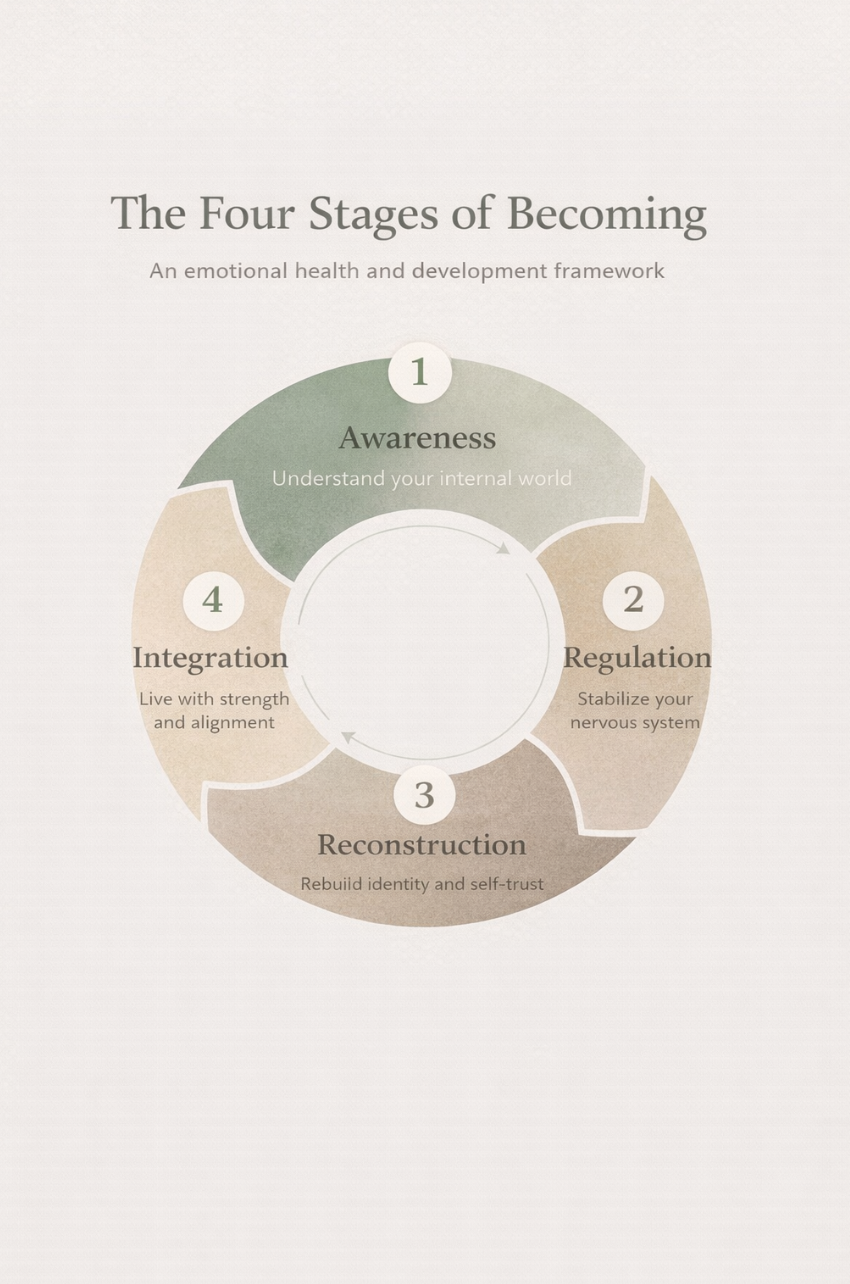Grounded in behavioral health science, emotional regulation, and lived experience, this framework provides a clear pathway for developing awareness, emotional stability, and self-trust. It is not about becoming someone new. It is about understanding yourself deeply enough to live with clarity, strength, and alignment.